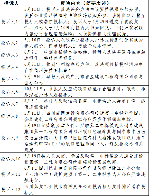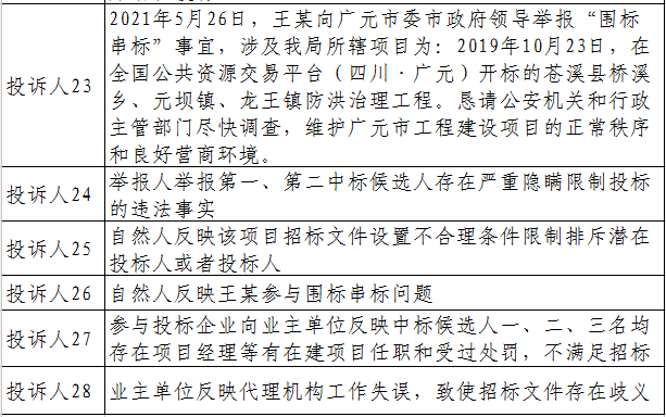 公开征求社会公众意见期间,共收到工程招投标领域突出问题系统治理投诉举报28条,其中交通行业2条,住建行业20条,水利行业3条,农业农村行业3条。具体情况如下表: