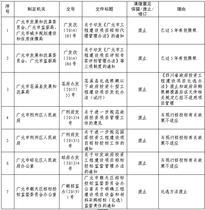 为深入贯彻落实“放管服”改革要求,营造更优营商环境,结合《四川省发展和改革委员会等9部门关于发布<四川省招标投标制度规则保留目录(2021年本)>的通知》(川发改法规〔2021〕506号)要求,决定废止《365体育竞彩足球_365日博登录_365bet娱乐注册工程建设项目招标代理管理办法》《苍溪县比选限额以下政府投资小型工程建设项目发包办法(试行)》等7个文件。凡废止的文件,一律不得作为行政执行监管依据。